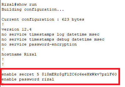 Kemudian kita verifikasi dengan perintah “show run”. Kemudian cari baris enable password dan enable secret.