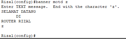 MOTD ini berfungsi untuk menampilkan message pada saat menyalakan router CISCO. Cara Settingnya yaitu masuk terlebih dahulu ke mode Global Configuration mode dan masukan perintah “banner motd z”.