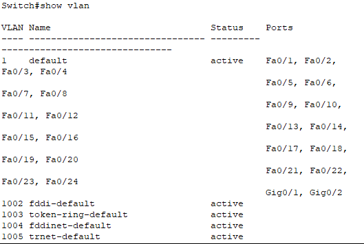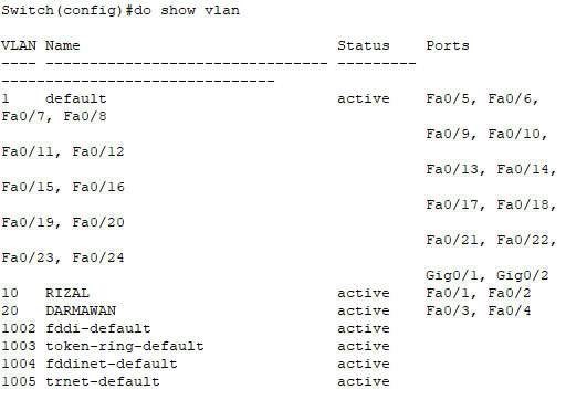 Bisa dilihat bahwa switch sudah memiliki vlan default, yaitu vlan 1 dengan nama default, lalu semua port yang dimiliki switch terdaftar di vlan 1. Sekarang kita akan membuat vlan 10 dan vlan 20, lakukan seperti gambar berikut