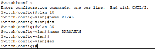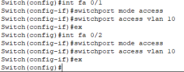 Setelah selesai membuat vlan, selanjutnya kita akan memasukan port-port fa 0/1 dan fa 0/2 pada vlan 10 dan fa 0/3 dan fa 0/4 ke vlan 20. Untuk vlan 10 lakukan seperti gambar berikut
