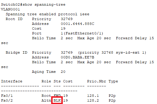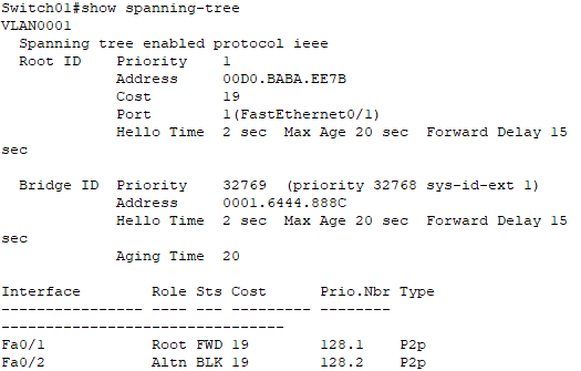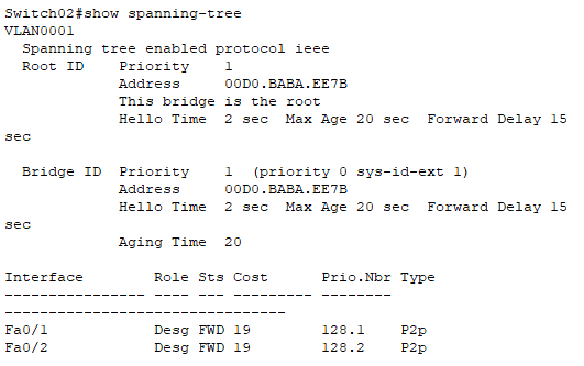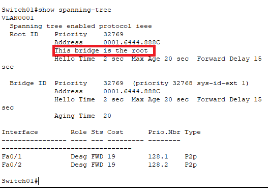 Pada switch 2 bisa kita lihat bahwa Interface Fa0/2 di block. Dan Interface Fa0/1 menjadi forward. Kita bisa lihat perbedaan di Antara keduanya, di switch 1 akan ada kalimat “This Bridge is Root” yang artinya bahwa Switch ini lah menjadi Root Bridge. Karena memiliki MAC-Address yang ter-rendah. Dan semua Port nya berstatus Forward.